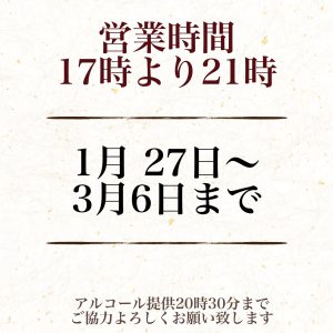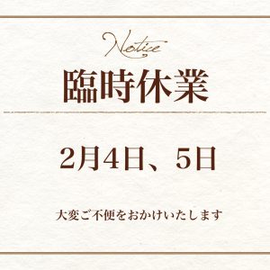 2022/02/04 本日と明日の二日間臨時休業させていただきます。 ご不便をおかけいたしますが何卒よろしくお願いいたします。