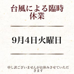 2018/09/04 台風接近により臨時休業致します。